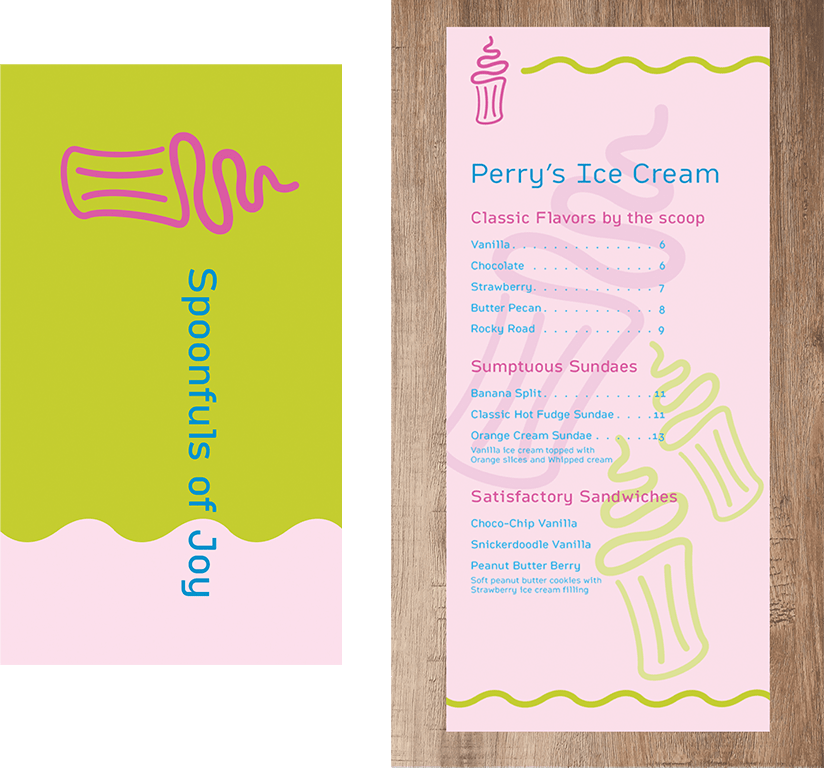 An ice cream shop is a place to gather and enjoy sweet fun during the sunny months. I chose a playful theme using bright colors that remind us of childhood and summer. I constructed whimsical swirly motifs for the logo and patterns which compose this brand identity.