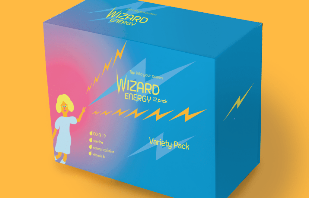 Wizard energy is an energetic and youthful brand that uses electric colors and fantasy imagery to make itself appealing to a younger crowd looking to bring excitement to their day. This drink brand will appeal to teenage and young adult caffeine drinkers as the bolt imagery captures the eye and gets the energetic message across.